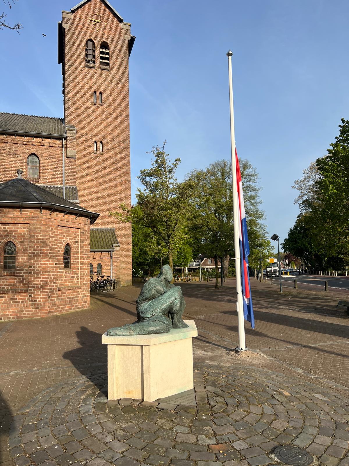 Bij dit herdenkingsmoment hangt de Nederlandse vlag halfstok.