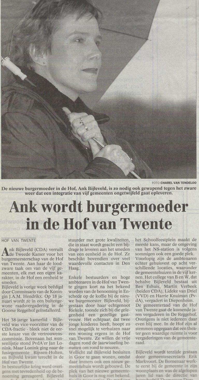 In 2001 was het gedaan met Ambt-Delden als zelfstandige gemeente. Door de gemeentelijke herindeling werd de plattelandsgemeente onderdeel van Hof van Twente. Ank Bijleveld werd daarvan de eerste burgemeester.