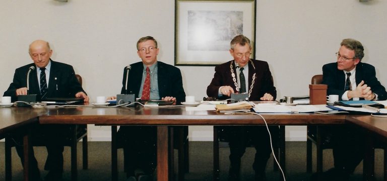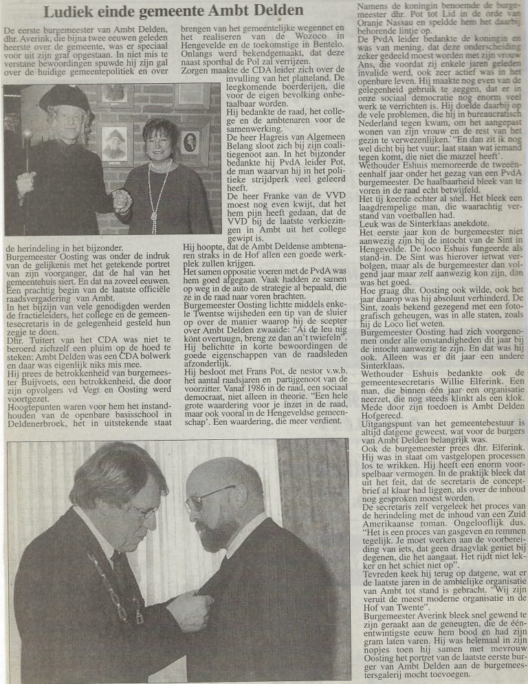 Het laatste decennium van de gemeente Ambt-Delden vond plaats onder leiding van de burgemeesters Bert van der Vegt (tot 1998) en Gerrit Oosting (van ’98 tot 2001). De raadsleden uit Hengevelde die deze periode mee maakten waren Ben Eshuis en Frans Pot die in deel 2 van deze serie artikelen al aan bod kwamen. Ben Eshuis is sinds 1990 wethouder. In 1991 maakt Annie Schreijer-Pierik (CDA) haar opwachting in de raad, Gerard Franke (VVD) volgde in ’95 Hendrik Wes op en Harrie Doeschot (CDA) werd in 1998 raadslid.