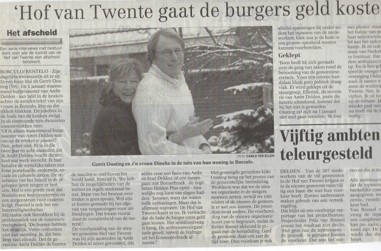Gerard Franke: ‘Moeilijk te zeggen, ik heb niet anders meegemaakt dan Ambt- en Stad Delden. Zoals ik er nu tegenaan kijk, denk ik dat het wel een goede beslissing is geweest, alhoewel ik nog steeds denk dat Ambt- en Stad Delden het prima samen hadden kunnen doen als heringedeelde gemeente.’
