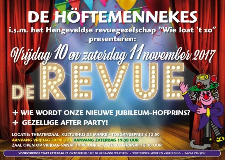 Op vrijdag 10 en zaterdag 11 november presenteren Carnaval Vereniging De Höftemennekes in samenwerking met het Hengevelde Revuegezelschap: “Wie laat ’t zo.” De revue in Kulturhus de Marke. Vrijdag begint het om 20:00 uur (zaal open 19:00 uur) en zaterdag om 19:30 uur (zaal open 18:30 uur). Voorzitter Bart-Jan van Hecke: ”Wie o wie wordt onze nieuwe Prins? Raadt u mee? Op zaterdag 11 november, (11e van de 11e!) om 23:11 uur zullen we het weten! Dat is 4 x 11! net als ons jubileum, het 44-jarig bestaan van CV de Höftemennekes! Maar daarover later meer. Naast Jubileumprins wordt de nieuwe hoogheid ook nog eens de nieuwe Hofprins van 2017/2018!” De voorverkoop gaat van start op zaterdag 21 oktober. Er zijn voor beide dagen wederom maximaal 500 kaarten beschikbaar. Wees er dus weer snel bij want op = op. Verkooppunten: De Bazar van Jon, Wolterinck Mode en Vakkleding en Varenbrink, Café de Gebrande Waateren.