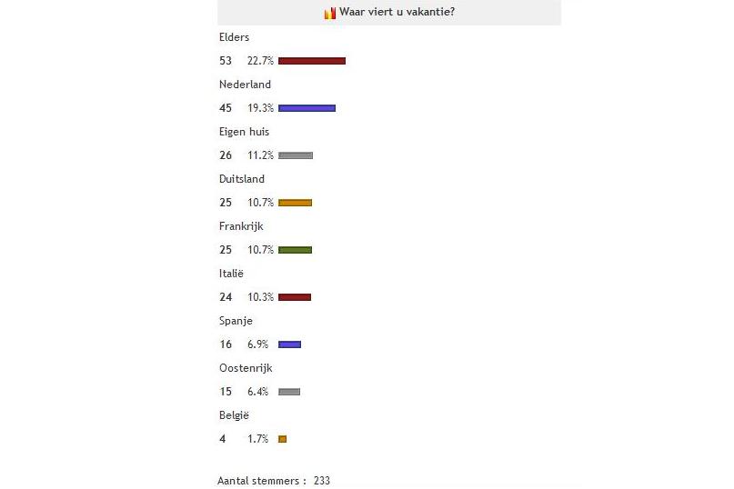 De bouwvak zit er al geruime tijd op en ook de schoolvakantie is voorbij. Afgelopen zomer hielden we een enquête waar de lezers van Wegdamnieuws hun vakantie zouden doorbrengen. Gebleken is dat ruim 19% van de 233 respondenten in Nederland bleef en 11% in eigen huis. Het grootste gedeelte (bijna 23%) koos voor een verdere vakantie, zij vulden 'elders' in. De overige keuzemogelijkheden waren de vakantielanden dichtbij Nederland. Dat waren de landen Duitsland (10,7%), Frankrijk (10,7%), Italië (10,3%), Spanje (6,9%), Oostenrijk (6,4%), België (1,7%). We wensen iedereen weer veel succes op werk, school of waar dan ook en hopen dat we bij volgende enquêtes weer op u kunnen rekenen.