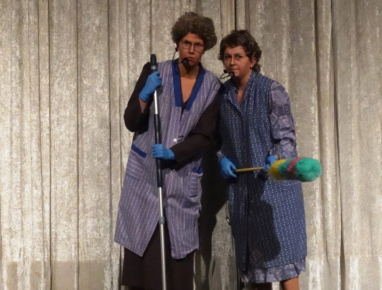 De revue begon deze keer met een openingslied van twee interieurverzorgers in de melodie van Herman van Veen met Opzij. “We zullen zingen, schminken spelen, dansen, kleden, lachen en weer doorgaan! (Filmpje zie fotoalbum)
