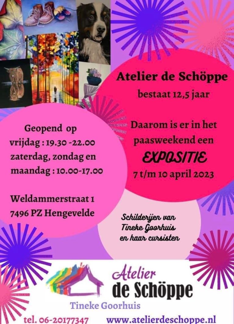 Atelier de Schöppe ( www.atelierdeschoppe.nl) bestaat namelijk al 12,5 jaar, en daarom is er in het Paasweekend ( 7 t/m 10 april 2023 ) een expositie waar iedereen van harte welkom is.