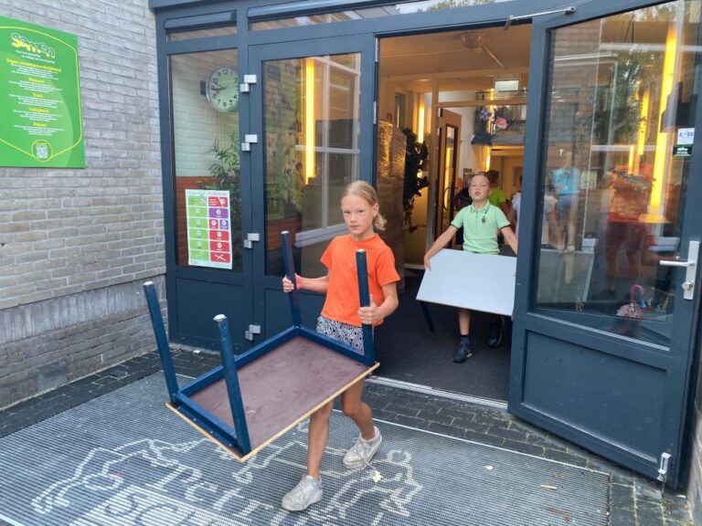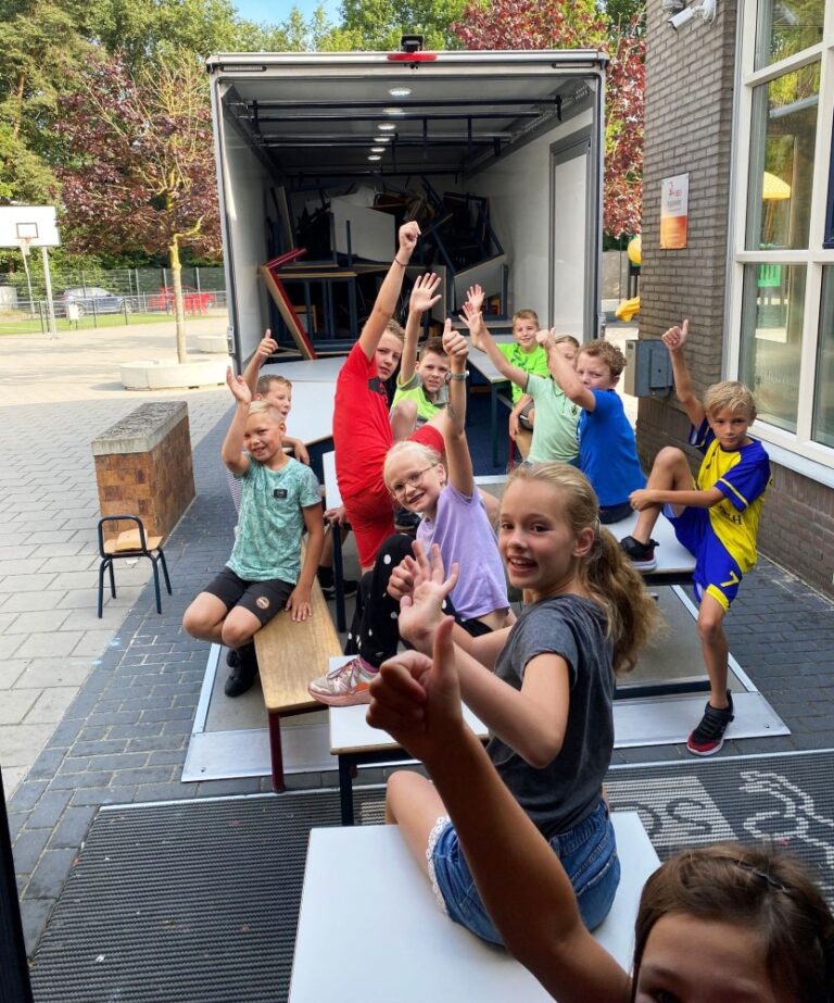 Met man en macht werd er door groep 7 van de Petrusschool te Hengevelde woensdagochtend de vrachtwagen van Très Chic Bridal Wear gevuld met schoolmeubelen voor het Afrikaanse land Sierra Leone.