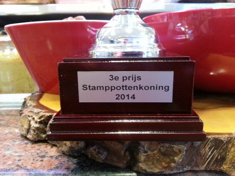 Woensdagavond was medewerker Elroy Belt van Keurslagerij Brummelhuis één van de deelnemers van de Stamppottenkoning vakwedstrijden, tijdens de open dag van het Slagersvakonderwijs SVO. Hij heeft meegedaan met de stamppot wortelen met hachee. Na een interessante strijd tussen maar liefst 30 inzendingen is hij uiteindelijk 3e geworden. Daar was volgens een goed gebruik een grote beker aan verbonden die nu trots in slagerij aan de Goorsestraat 33 staat. Deze stamppotten komen natuurlijk uit de eigen keuken zoals zij alle stamppotten zelf maken.