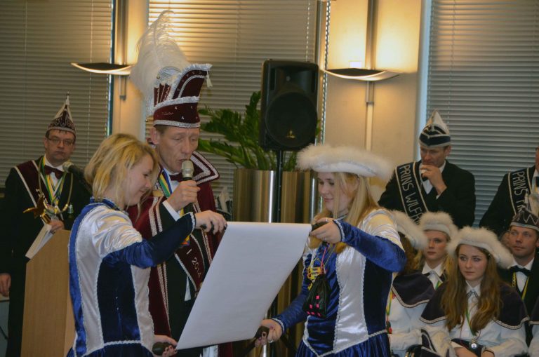 Vanochtend was geheel volgens traditie de sleuteloverdracht op het gemeentehuis. Burgemeester Nauta, die haar eerste Carnaval als burgemeester van de Hof meemaakt, overhandigde de sleutel aan Hofprins Wouter I. De ochtend op het gemeentehuis werd bijgewoond door de Hengeveldse carnavalsvereniging de Höftemennekes, Goorse carnavalsvereniging Sterzo en de Bentelose carnavalsvereniging de Hagmöllnlummels. Ook de bijbehorende dansmarietjes van alle verenigingen waren present en lieten prachtige shows zien aan de vele aanwezigen. Een veel gehoord onderwerp waren de kunstgrasvelden in de Hof. President René Temmink van de Bentelose vereniging hamerde steeds op een kunstgrasveld in Bentelo, maar liet aan het eind van zijn verhaal weten zich hard te maken voor een tweede kunstgrasveld in Hengevelde. Of hij en zijn Hofprins Wouter I deze uitspraak nakomen is echter nog maar te bezien.