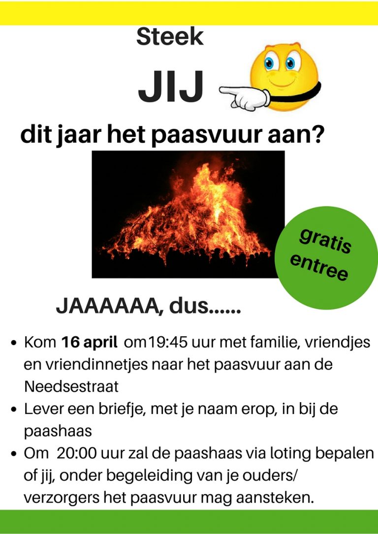 Dit jaar aan een van de aanwezige kinderen de eer om het paasvuur aan te steken.....wie wil dit nu niet! Om hierop kans te maken kun je/ kan je kind op die 16e april een briefje met zijn/ haar naam erop, inleveren bij de paashaas. Deze zal om 20 uur via loting bepalen wie van de aanwezige kinderen mag helpen het paasvuur "in de hens te steken"!