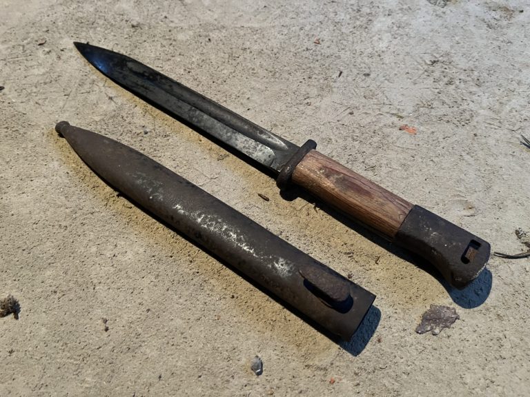 Naast de vele gereedschappen en werkmaterieel voor houtbewerking, komen we ook spullen tegen uit de oorlog. Veel Duitsers hebben zich in de omgeving van de werkplaats schuil gehouden tijdens de Tweede Wereldoorlog en het een en ander is achtergebleven. Dit ligt ook in de werkplaats. Zo is er nog onder meer een mes te zien van de Duitsers, welke de terugreis naar Duitsland niet heeft gehaald.