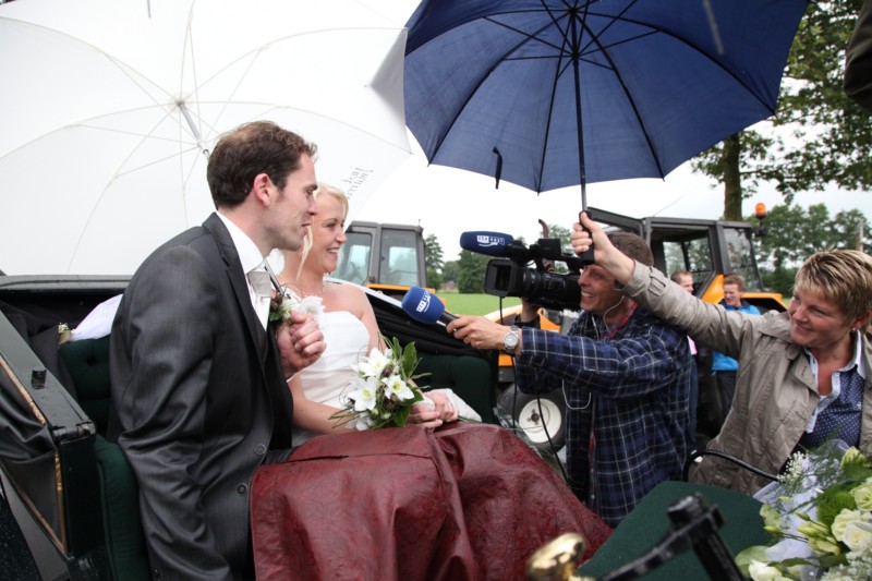 Volgens de traditie werd de koets van het stel staande gehouden en mocht het paar de weg pas vervolgen nadat alle vrienden voorzien waren van een alcoholische versnapering. Zelfs TV Oost werd ingeschakeld en zo waren de aanwezigen zelfs op televisie te bewonderen gisterenavond in Overijssel Vandaag.