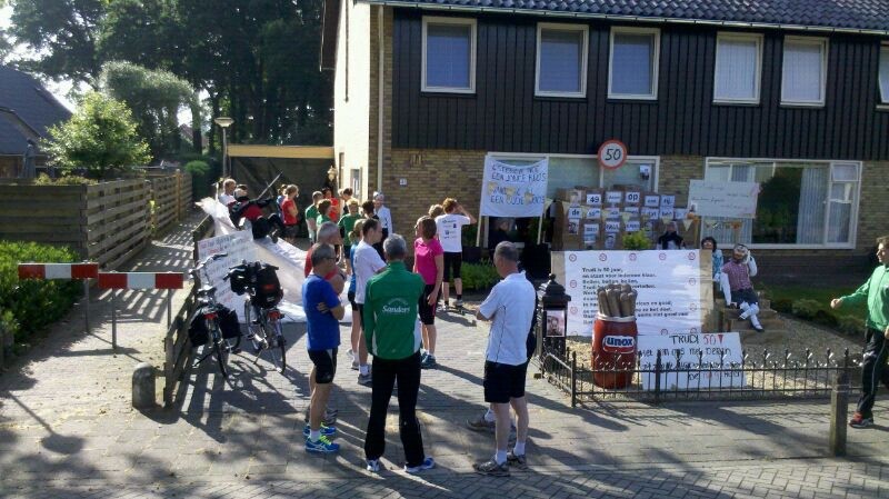 Het volledige ledenbestand van de F.S.T.H. (Fysio Sport Trainingscentrum Hof van Twente) of wel de loopvereniging van Hengevelde was hedenochtend aanwezig om de Sarah-tuin te bewonderen. En voor wie dacht dat Trudi (geboren aan de Kinkelerweg 4) vandaag een “time-out” zou nemen wat hardlopen betreft heeft het mis; hier op de foto maken de deelnemers van de wekelijkse loopsessie zich op voor de Sarahloop! Zelfs op deze dag wordt haar grootste hobby doorgezet!