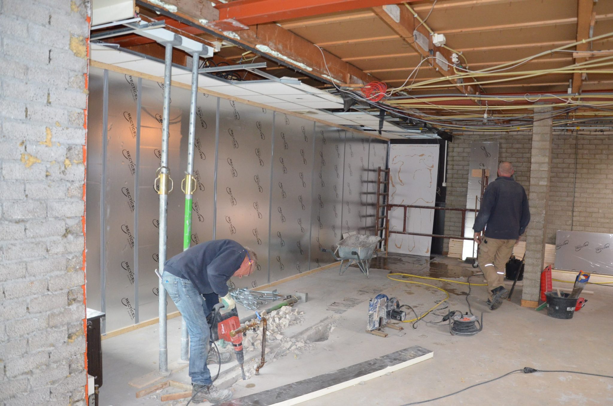 Aansluitende aan het ophogen van de dakconstructie zal er intern verder gegaan worden met het vernieuwen van de toiletgroepen en de diverse algemene ruimten. Op dit moment is Semmekrot Installatietechniek gestart met het ombouwen van de huidige heren- en mivatoilet en is er gestart met het opbouwen van een volledige nieuwe damestoiletgroep in de bestaande garderobe.