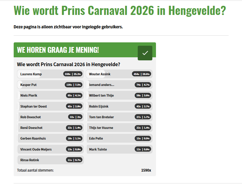 Het is de vraag die Hengevelde al weken in zijn greep houdt. Wie wordt dit weekend verkozen tot nieuwe Prins Carnaval van CV De Höftemennekes voor het carnavalsjaar 2026. Diverse namen doen de ronde en dit jaar hebben we te maken met een outsider. Niemand minder dan Laurens Kamp kreeg de meeste stemmen. Ook de nummer twee in de peilingen was naam die nog niet vaak hoog stond: Wouter Assink. Laurens kreeg respectievelijk 35,2% van de stemmen, Wouter 28,6% van de stemmen. Als we zien dat er 1590 keer gestemd is in de afgelopen weken, weten we dat Carnaval leeft in Hengevelde!