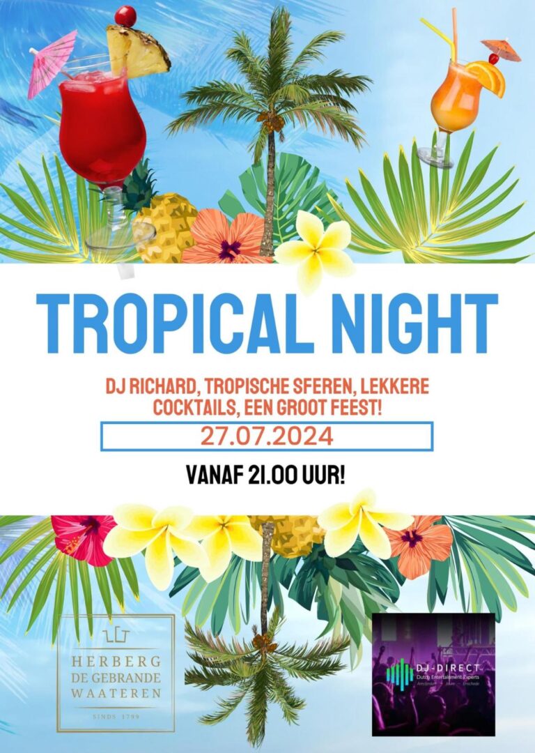 Vanavond is het zover, de derde Tropical Night bij Herberg de Gebrande Waateren. Casper Bebseler: “Voor alle thuisblijvers gaan we er een groot feest van maken! DJ Richard draait die tropische hits en onze cocktailbar met lekkere cocktails vanaf 1,5 munt is er ook weer natuurlijk!! Kom dus gezellig langs voor een leuke avond in en om de Herberg!”