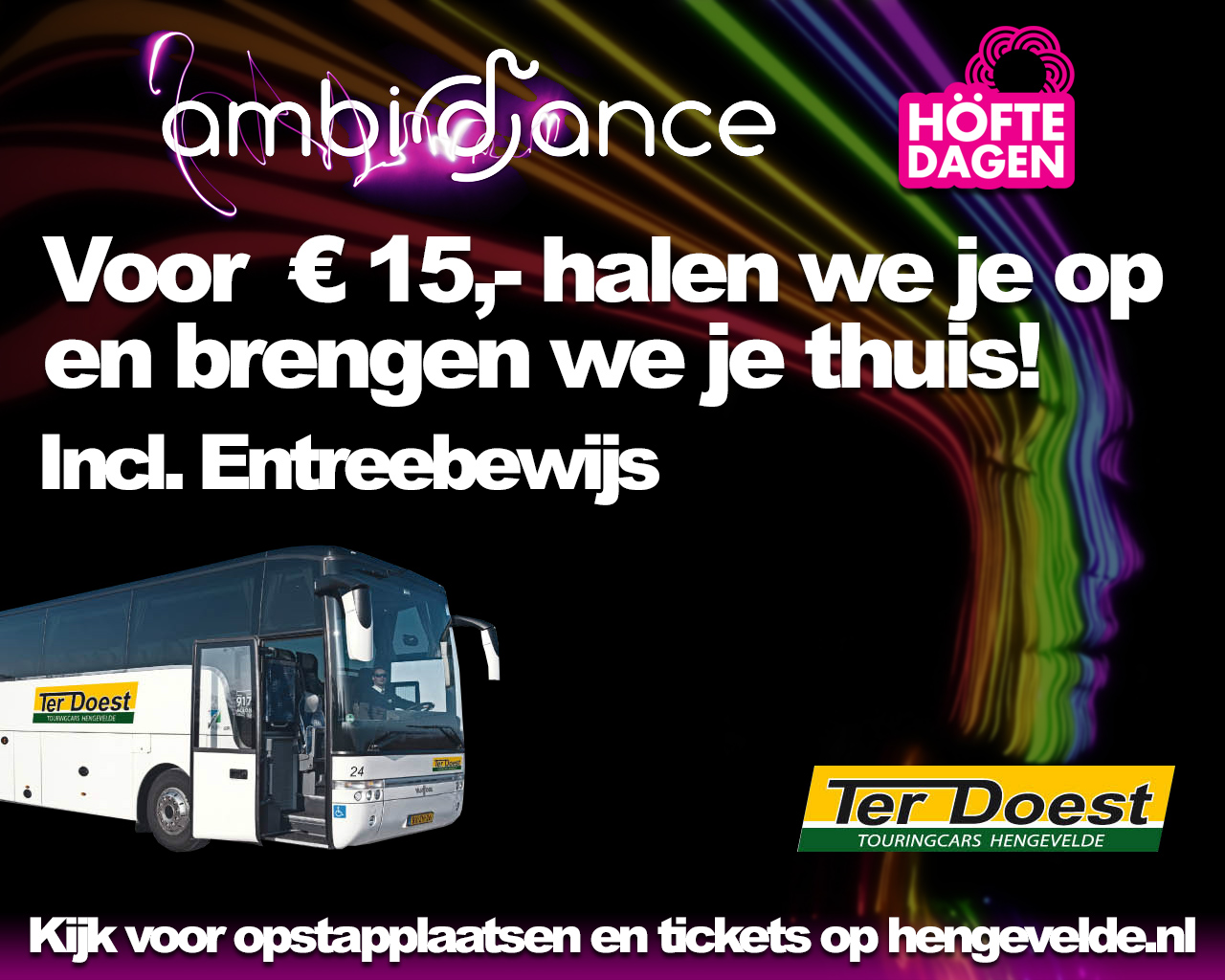 Dit jaar biedt de organisatie van de Höftedagen haar bezoekers voordelig taxivervoer aan tijdens het dance-event Ambi(D)ance: het taxivervoer van en naar jouw woonplaats en een entreebewijs, samen voor slechts € 15,-. Met een ticketprijs van € 10,- betekent dit in de praktijk dat het taxiritje van en naar Hengevelde nu slechts € 5,- kost.