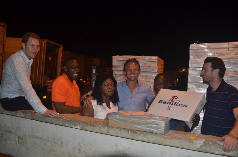 Ook vandaag bleek weer overduidelijk: Ghanezen houden van vreemdelingen. Of het nu blank of zwart is, overal wordt je begroet met een vrolijkheid die zijn weerga niet kent. Op markten wordt je lachend nageroepen, continu blijkt het een feest om in Ghana te zijn. Ook de mensen van Wegdam Food Link hebben het duidelijk naar hun zin. In de haven wordt nog een kijkje genoemde hoe de ingekochte koelcontainers staan te wachten op transport. De beveiliging is strikt: no pictures!”, wordt er gelijk medegedeeld bij binnenkomst. (Dan maar met de telefoon zie fotoalbum)