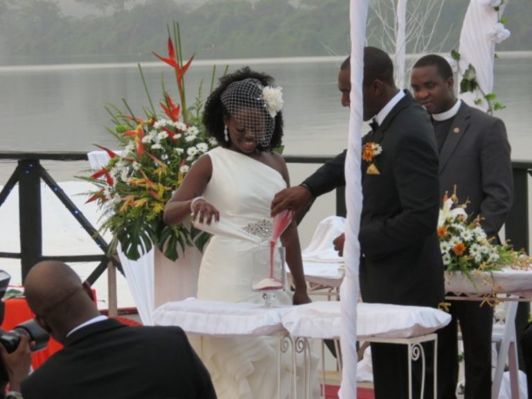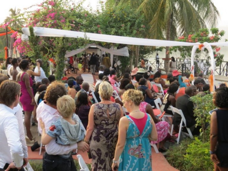 De bruiloft was ongeveer twee uur rijden vanuit Accra en werd gehouden in een hotel gelegen aan een meer in Volta region. Om 15.00 uur zou het feest van start gaan met een ceremonie, dat het om 13.00 bestelde diner nog niet klaar was mocht de pret niet drukken gezien het feit dat het toch pas om 17.00 uur begon. Brian: "Bijzonder om te zien, mensen die ruim twee uur zaten te wachten in prachtige kledij, in de brandende zon en niemand die klaagt of zich er überhaupt over verbaasd! Welkom in Afrika, welkom in Ghana! De entourage vervolgens was werkelijk prachtig, het bruidje kwam aangevaren met voor haar twee kleine roeibootjes vergezeld met trompetter geschal. Anne was bruidsmeisje waarbij haar blonde koppie behoorlijk afstak bij de rest.