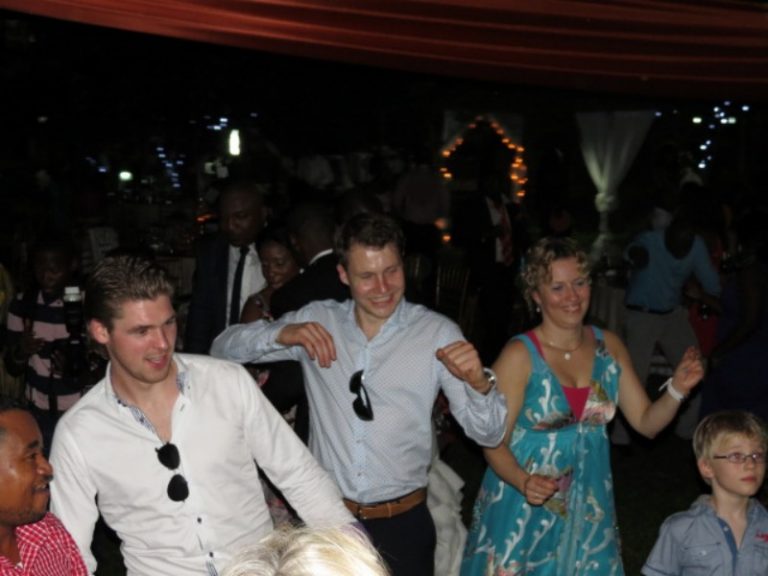 De ceremonie was plechtig waarna het feest werkelijk losbarste, maar dan ook echt! Alles speelde zich af in de buitenlucht, bijzondere smaakvolle versieringen, overheerlijk eten en drinken. Afrodans afgewisseld met Ootmarsumse boerendans waarbij het geheel werd afgesloten met een nachtelijke duik in het zwembad.”