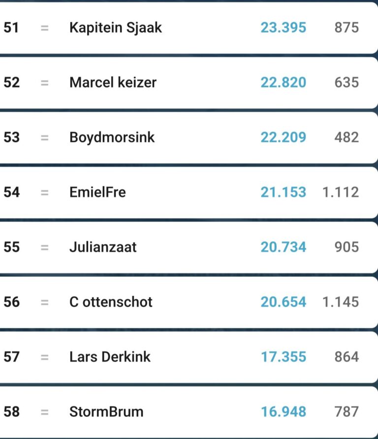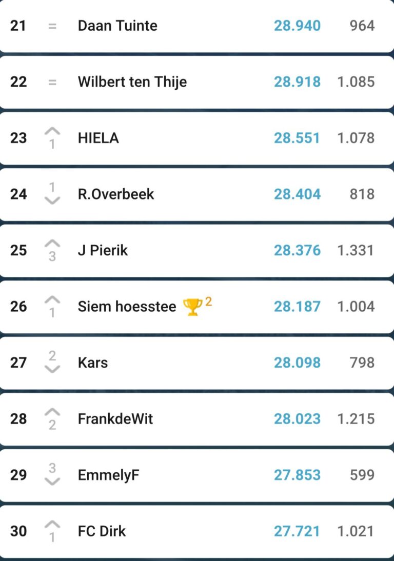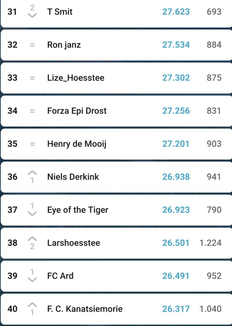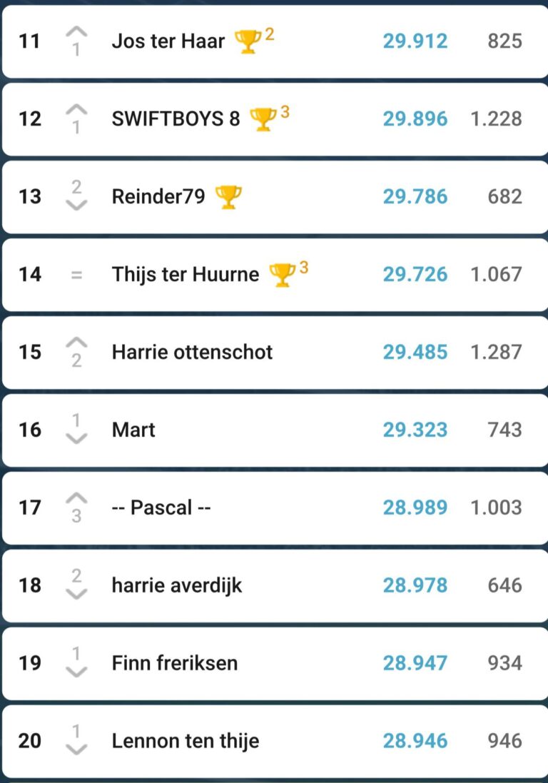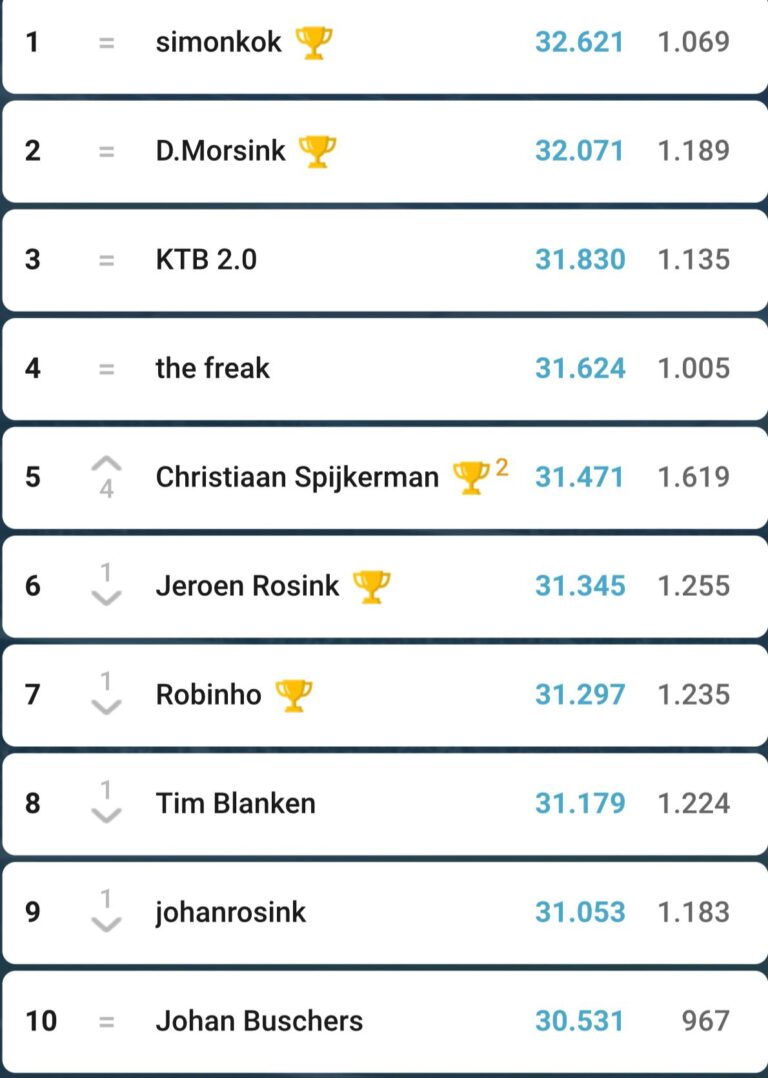 De nummers twee Dani Morsink en drie Kevin ten Buuren van 2024 hebben een behoorlijke achterstand, die in twee speelrondes nauwelijks goed te maken zijn; We gaan het zien!