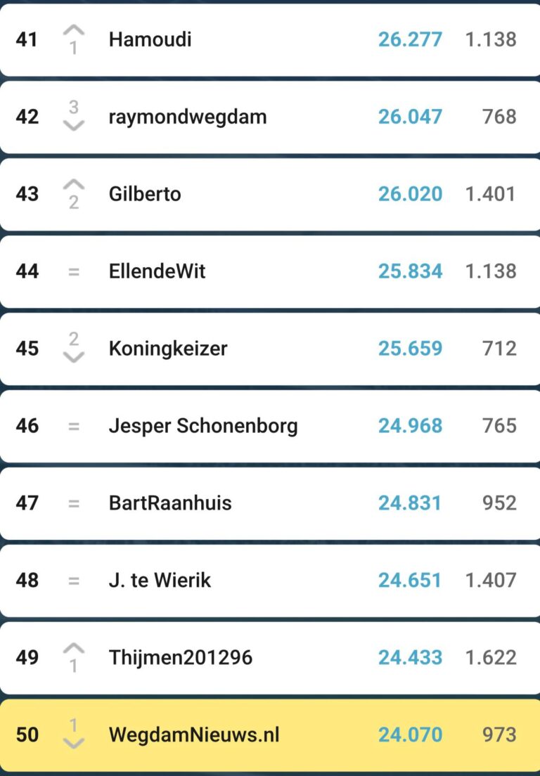De Wegdamnieuws Eredivisie nadert zijn ontknoping. Met nog twee speelrondes te gaan is het Simon Kok uit Velp die de ranglijst aanvoert! Simon is een collega van Robin Raanhuis en won in 2019 de Tour de France poule. Voor eerst in de geschiedenis won iemand van buiten Hengevelde de Tourpoule.