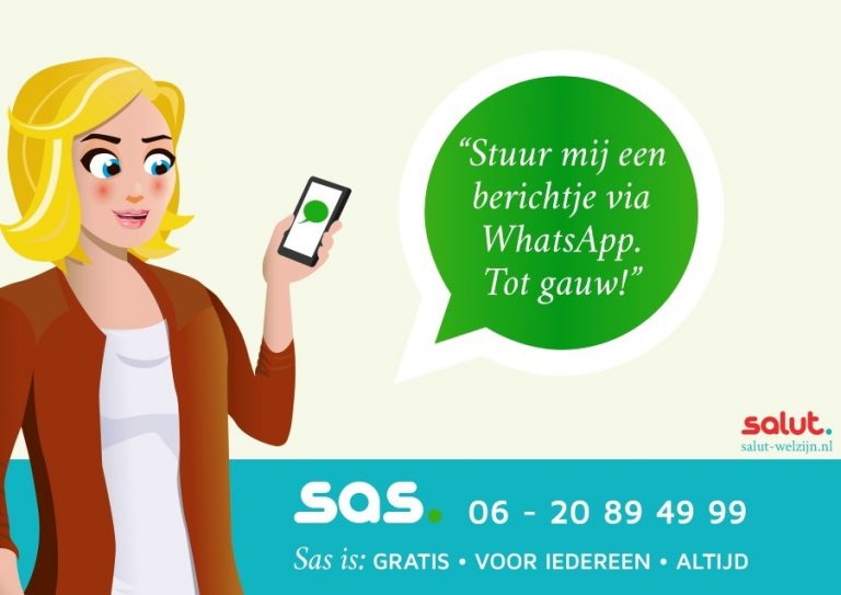 Krijgt Sas het appje onder kantoortijden, dan reageert ze direct. Die reacties zijn in feite afkomstig van de professionals van Salut. Is een simpel antwoord via WhatsApp niet voldoende om je verder te helpen, dan maakt Sas een afspraak met je als je dat wilt. Buiten kantooruren verstuurt Sas eerst een ontvangstbevestiging. Op de eerstvolgende werkdag volgt dan de inhoudelijke reactie op de vraag. Sas is bereikbaar via: 06-2089 49 99.