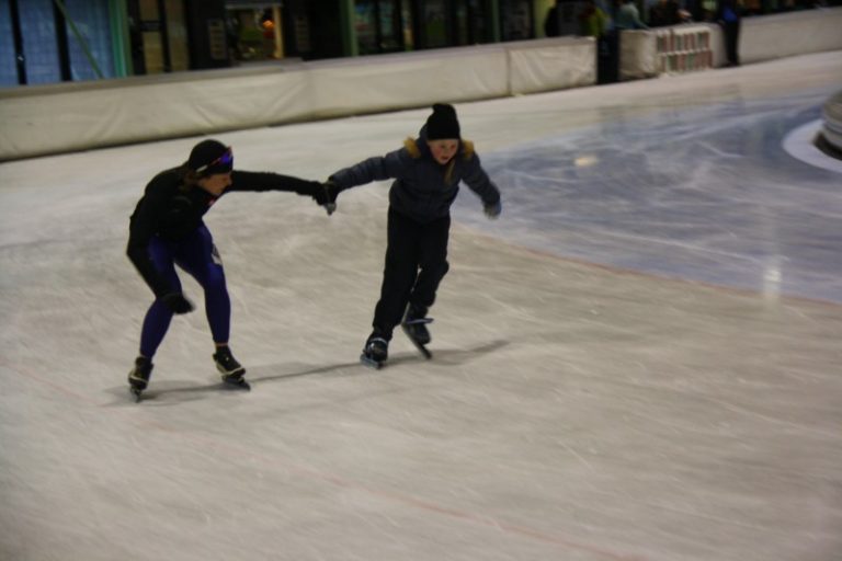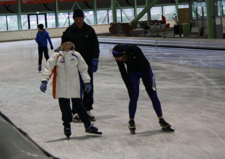 Eindelijk was het dan zover. Na diverse mailwisselingen, kon op zaterdag 8 februari 2014 de schaatsclinic doorgaan. De gekoesterde wens is afgelopen zomer gedropt door Sanne Derking bij de Höftedagen en wat was haar wens? Sanne wou graag schaatsles van niemand minder dan Oudnederlands kampioen allround schaatsen Moniek Kleinsman; en zo geschiedde! Met een gezonde dosis spanning wachtten we haar op in de schaatshal in Enschede. Na een snelle kennismaking en nadat beide dames de snelle ijzers hadden ondergebonden. kon de clinic beginnen. Wat waren de belangrijkste tips? Sanne Derkink: “Na eerst een rondje te hebben geschaatst vertelde Moniek mij dat de been- en buikspieren zeer belangrijk waren. Ik moest maar eens mijn buikspieren aanspannen en zo weg schaatsen”.