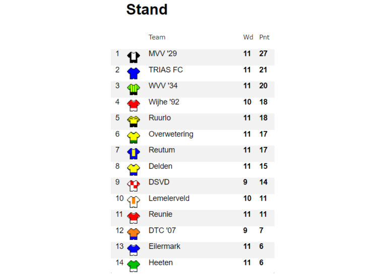 WVV’34 hervat zondag om 14.30! de competitie met een uitduel tegen sv Delden. Sv Delden zit niet bepaald in een flow. De ploeg, die op een 8e plek is terug te vinden begon de competitie nog goed, maar verloor de laatste drie duels. Vorige week werd nog met 6-1 verloren van DSVD. De laatste twee duels voor de winterstop gingen eveneens verloren, waaronder tegen DTC’07 die op dat moment de rode lantaarn in handen hadden.