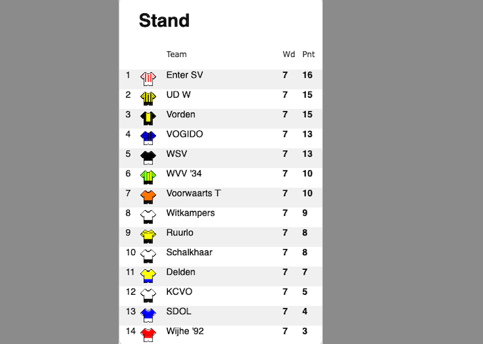 WVV’34 staat na de overwinning van afgelopen zondag op een keurige zesde plek met 10 punten uit 7 wedstrijden. De marges zijn nog klein, want hoewel Delden op de 11e plek staat, heeft het slechts drie punten minder.