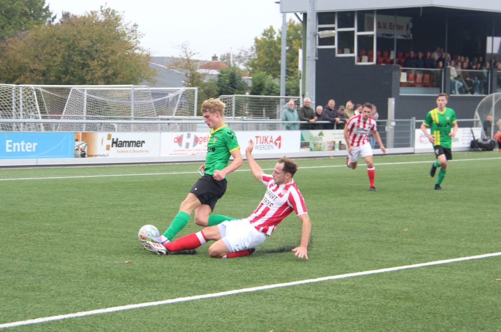 Koud uit de kleedkamer ontbreekt wederom de scherpte en doortastendheid waardoor de 3-1 binnen één minuut al in het net lag. Nadat Valentijn Rupert de aansluitingstreffer maakte en WVV’34 probeerde druk te zetten, viel in de omschakeling de 4-2. Hier ging ogenschijnlijk een overtreding op Stan Wegdam aan vooraf, die helaas voor de Hengeveldenaren niet gezien werd door de scheidsrechter. Verderop had de score nog hoger uit kunnen vallen, maar gelukkig werd de gegeven penalty door SV Enter naast geschoten. In het restant waren er nog weinig kansen waardoor WVV’34 met een nederlaag huiswaarts keerde.