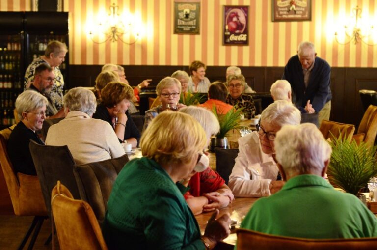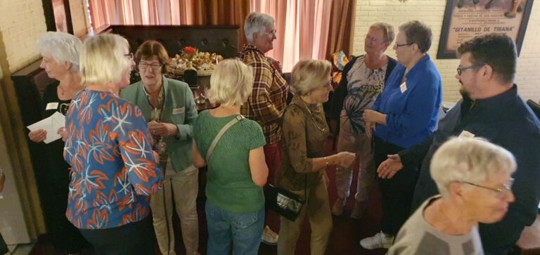 Onder het genot van een hapje en drankje ontstond een gezellige middag waarin al snel gesprekken ontstonden over gezamenlijke herinneringen en vonden hernieuwde kennismakingen plaats.