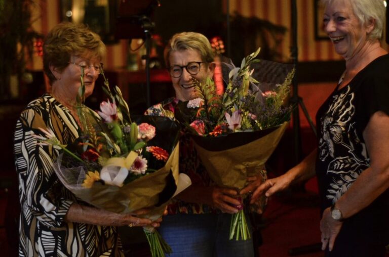 De eerste en laatste voorzitter, Mariet Eijsink en Giny Geerling openden de middag met een luchtig historisch overzicht en gedicht. Zij werden bedankt voor hun inzet met een prachtig boeket bloemen.