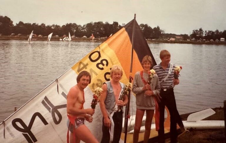 Van mijn neef Harry ten Thije heb ik leren surfen en samen met hem, iemand van Wielens en Harold Nijhuis heb ik meegedaan aan een 24-uurs surfrace op ‘t Grasbroek. Inmiddels zat ik op de mavo in Delden en maakte daar veel nieuwe vrienden uit onder andere Delden en Goor. Met hen ging ik veel surfen en maakte ik ook kennis met het uitgaansleven.’