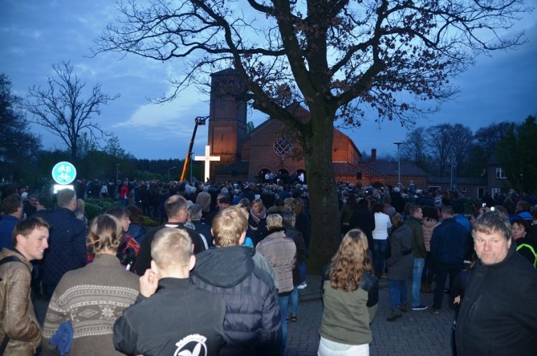 De schattingen liepen ver uiteen, waren er 1500 of toch 2000 bezoekers bij de Passie in Bentelo vanavond? (KLIK HIER VOOR FOTO’S EN FILMPJES) Om 20.00 uur begon de verteller, vanaf het balkon aan het hoofdveld op Sportpark De Pol in Bentelo, zijn verhaal richting de mensenmassa. (“Dat is lang geleden dat ik op een voetbalveld heb gestaan” was de opmerking van een oudere aanwezige) Het verhaal van zo’n 2000 jaar geleden over de kruistocht van Jezus, gevolgd door een menigte dat zich voetje voor voetje voortbewoog door destraten van Bentelo richting de kerk. Stephan Ottink, de initiator van het event meldde dat het geheel zich in ongeveer een uur zou afspelen, dat werden er 2½. Bij het startpunt, onderweg en natuurlijk in de Paasparty-tent is er muziek van lokale bandjes en zangers.