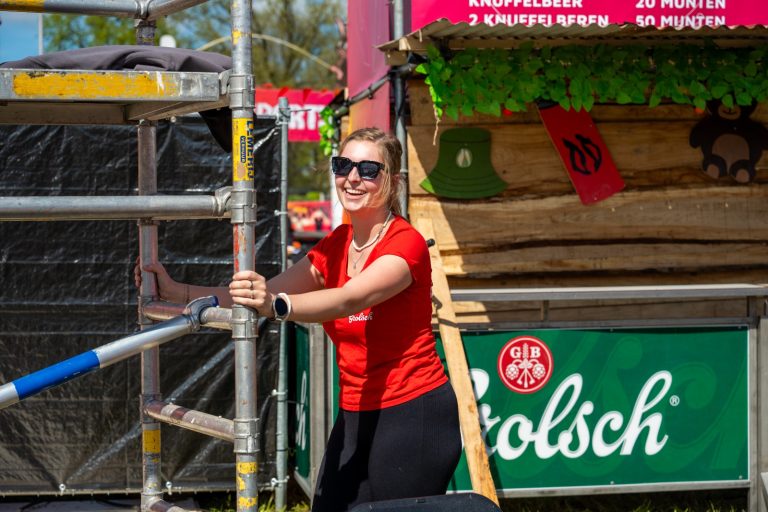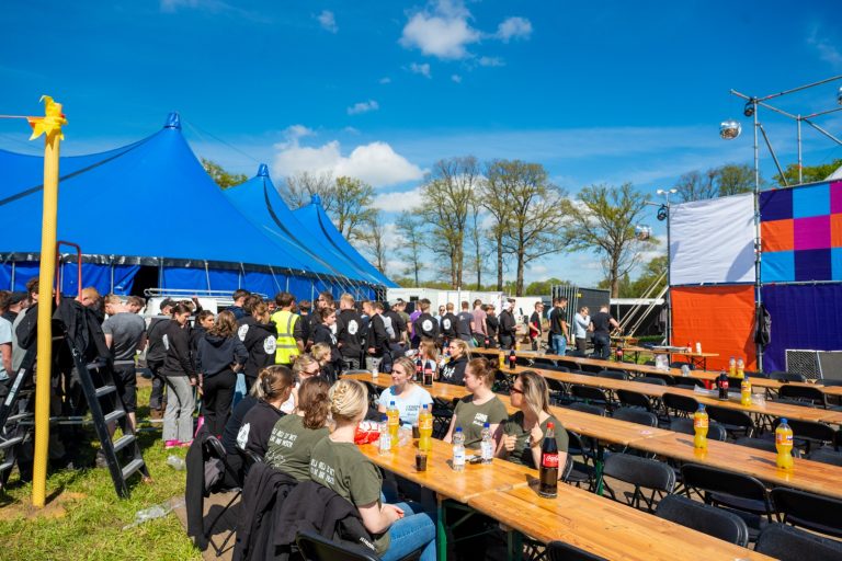 “Vanaf september zitten de eerste vergaderingen er al in. Een hoofdbestuur en zo’n twaalf commissies denk aan techniek, horeca, veiligheid en tentmanagers komen dan maandelijks samen om het evenement in goede banen te leiden. Maar vanaf het eerste weekend van april is het volle bak actie: op twee vrijdagen, twee zaterdagen en zelfs door de weeks in de avonden, wordt er gebouwd aan het festivalterrein. De eerste zaterdag zo’n 100 man aan het werk, de tweede meer dan 250.