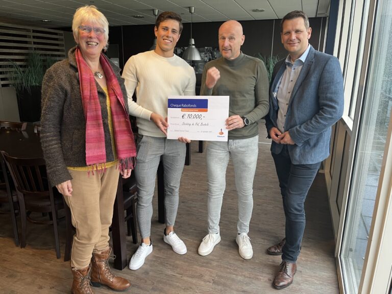 Op de foto staan Rabobank ledenraadsleden Martine Guitjens en Gerbrand van Burgsteden die namens Rabobank Centraal Twente de cheque aan Nick Sueters en Jurgen Rekers mochten uitreiken.