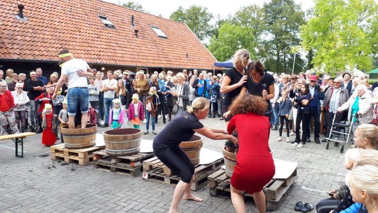 Het jaarlijkse Wijnfest bij Wijngaard Hof van Twente in Bentelo vond gisteren plaats onder een stralend zonnetje. Dit jaar stond het Wijnfest in het teken van het eerste NK-wijnstampen, waar diverse teams bloedfanatiek waren (klik HIERvoor een video). Teams van vier personen gooiden druiven in een bak, stampten het en brachten het naar een emmer. In deze strijd wonnen de Zuidelijke Passievruchten met een 'opbrengst' van 6,1 liter. Hiermee bleven ze De Bloxs voor met 0,1 liter. Ilse Visscher: "Het was een hele geslaagde dag, waar zo'n 1000 bezoekers zijn geweest. Veel belangstelling dus en de sfeer was geweldig, geneugelijk genieten!". Bezoekers werden ontvangen met federweisser en Zwiebelkuchen en er was voor de kinderen genoeg vertier. Heerlijke kraampjes met eten en drinken en uiteraard ontbrak het niet aan de nodige wijn.