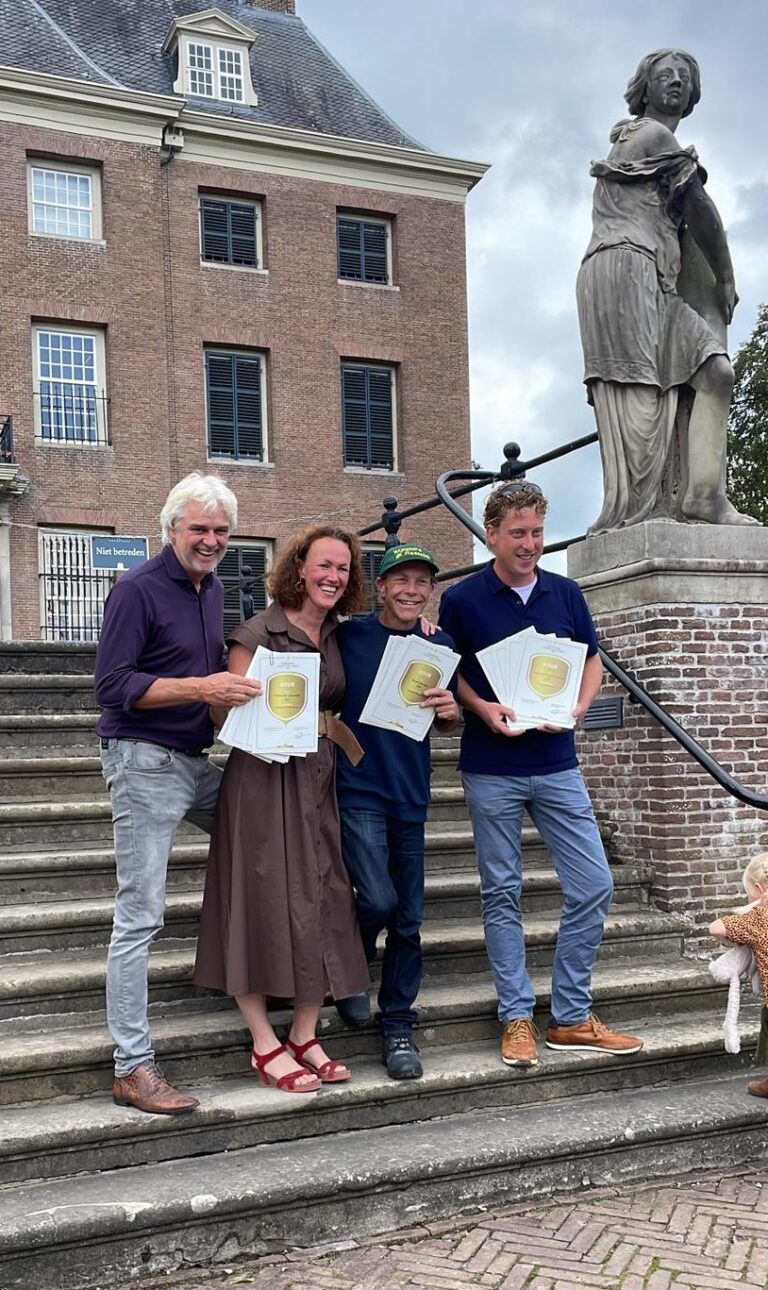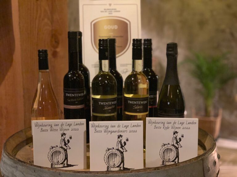 “Op zondag 18 september mag u ze komen proeven bij ons in Bentelo, tijdens de open dag!”, roepen de gelukkige wijngaardeniers Ilse en Roelof Visscher uit Bentelo. Deze wijnmakers waren dé grote winnaars tijdens de Wijnkeuring Lage Landen afgelopen zondag bij Kasteel Amerongen. Met twee andere deelnemers, ontvingen ze de ereprijs voor ‘Beste Wijngaardenier van de Wijnkeuring’. Ilse Visscher vertelde vorige week bij SBS6 in het programma HLF8 al, dat ze een goed voorgevoel had over de ingezonden wijnen uit Bentelo. Dat gevoel was prima, want van de door hen 8 ingezonden wijnen kregen er 4 een zilveren en 4 een gouden medaille. “Ongekend, supertrots en heel blij mee”, aldus Ilse, Roelof en hun team. De keuring gaat vooraf aan de Open Dagen waarop veel wijnboeren hun bedrijf open stellen. Na twee jaar zónder open dag, is Wijngaard Hof van Twente zondag 18 september open van 13.00 – 18.00 uur. Zie ook www.twentewijn.nl/nieuws/open-dag.