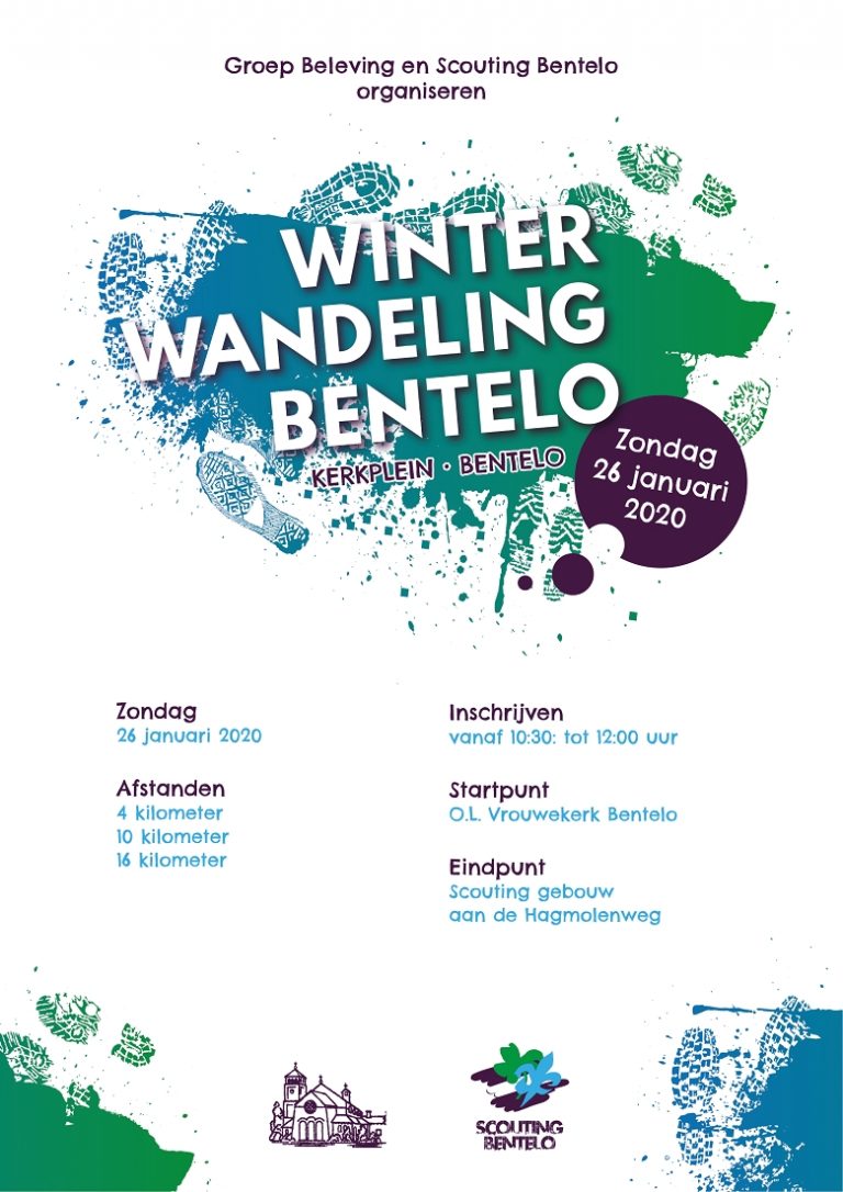 Wandelen in de prachtige omgeving van het kerkdorp. Dat kan op zondag 26 januari in Bentelo, de 2e editie Winterwandeling Bentelo. Er zijn 3 (nieuwe) routes uitgezet met afstanden van circa 4, 10 en 16 kilometer met onderweg een rustpunt. De organisatie is in handen van Scouting Bentelo en Werkgroep Beleving OLV.