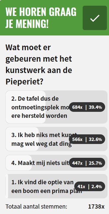 Dat de tafel in ere hersteld zal moeten worden naar een ontmoetingsplek kon op maar liefst 684 stemmen rekenen.