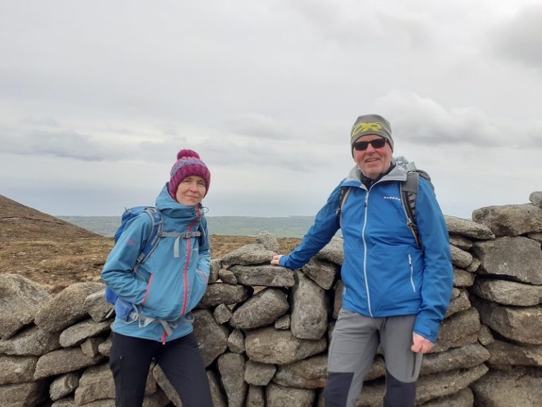 <<Diane en John in de heuvels van Win Hill, vlak bij hun huis in Hope. Op de achtergrond zie jet het Ladybower Reservoir, een stuwmeer dat 80 jaar geleden aangelegd werd.