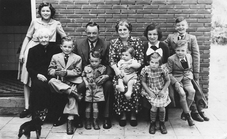 zat er vaak maar de helft; opoe, vader en moeder, de paar kinderen die nog thuis waren, de dienstmeisjes en Johan Vossebeld die bij ons in woonde (tot hij met Dien Diepenmaat trouwde) en werkzaam was op het bedrijf. Je kunt wel zeggen dat ik niet in een standaardgezin ben opgegroeid. Alleen in de vakanties waren alle kamers bezet. In ons huis voor de verbouwing in 1954/’55 sliepen we in de vakanties met vijf man op één kamer. Frans, Jules, Paul, ikzelf en ook Johan Vossebeld. Hij had in de mijnen gewerkt in Limburg en kon daar prachtig over vertellen. We luisterden graag