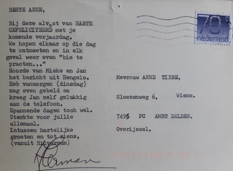 Het klikte tussen Herman en de familie Tibbe die in ’43 naast Hendrik en Anne bestond uit de dochtertjes Marietje en Dieni. Anne was hoogzwanger van zoon Hennie die 26 augustus geboren werd. Herman kwam ook de jaren erop, in totaal vijf keer. Ook zijn ouders die een meubel- annex schildersbedrijf hadden, kwamen een paar keer op bezoek bij de familie Tibbe. ‘Dat waren ook leuke leu’, zegt Theo.