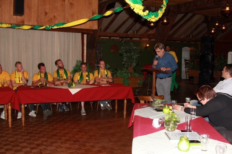 Wat gaan we volgend seizoen doen? Ik weet dat een aantal WVV’ers hem nu al knijpt, want Tom ten Breteler is gestopt. Onze topscorer. Onze aanvoerder. De atleet met het uithoudingsvermogen van Mo Farah. Ik sprak hem vanmiddag en vroeg hem waarom. Ik snap hem wel. Maar dat het jammer is, is zeker. Want hij was al die jaren een zeer waardevolle, gemotiveerde en sportieve speler. Een voorbeeld voor velen. Twee achterneven van mij stoppen ook. Wouter en Bas. Wouter is 34 jaar en zou nog goed meekunnen. Hij heeft een degelijk seizoen gedraaid met liefst 11 keer een clean sheet. Oké hij is 34. Maar dan Bas. Zijn vader Richard vertelde me een tijdje geleden al dat Bas lager wilde gaan voetballen. Hij is pas 31, hoorde ik. De zelfde leeftijd als Wout Brama. En dan lager spelen. Dat kan toch niet waar zijn. Maar het is blijkbaar toch waar. Ook heel spijtig. Ik wil hem straks eens vragen waarom. Zijn vader was er ook verbaasd over. Jos ter Huurne zet er ook een punt achter. Ook jammer. Een elftal heeft altijd behoefte aan een paar routiniers. Heel WVV zal hen missen. Erik Kluin legt de vlag in de kast. Na 20 jaar Twenthe Goor en tien jaar WVV mag dat. Of het gezegde dat een goede grensrechter per seizoen negen punten regelt voor zijn ploeg ook voor Erik geldt, betwijfel ik. Hij verstond zijn taak. Tot slot Mariëlle Nijhuis. Zij stopt ook. Ik hoorde van de spelers dat ze een voortreffelijke masseuse was. Tom de doelpuntenmaker en voorbeeldige aanvoerder, kilometervreter Bas, rots in de branding Jos en Wouter, de soliede cipier van het elftal, Erik de vakkundige vlagger en de even vakkundige verzorgster Mariëlle zou ik willen verzoeken om te gaan staan. Laten we hen bedanken met een ovationeel applaus van precies een minuut. Tien seconden per persoon.
