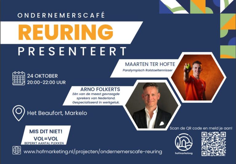 4 oktober organiseert HofMarketing hét ondernemerscafé voor ondernemers uit de gemeente Hof van Twente. Bij de 5e editie van Reuring in het Beaufort in Markelo, hebben we uitgepakt met twee inspirerende sprekers: Arno Folkerts en Maarten ter Hofte. Tijd voor Reuring!