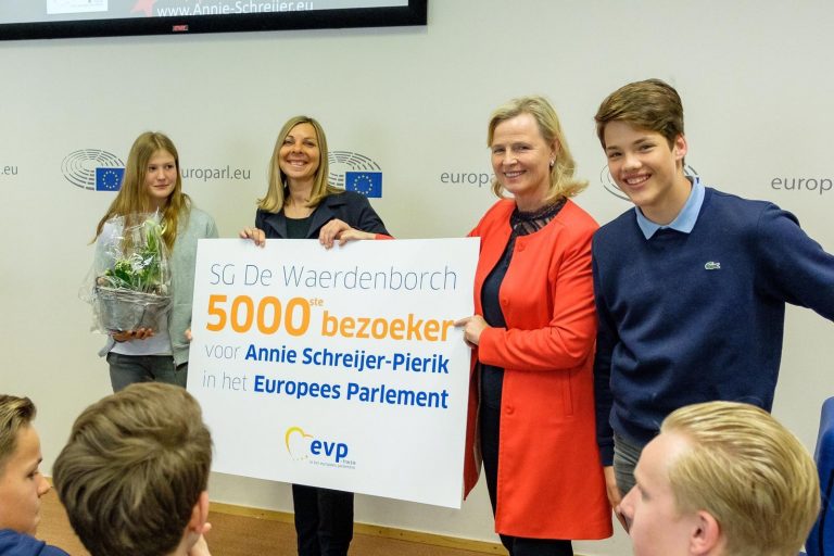 Vandaag ontving Annie haar 5000-ste groepsbezoeker in het Europarlement. Het was docente Yvonne Mulder van SG de Waerdenborch die de eer te beurt viel om deze bijzondere mijlpaal te vieren. Ze gaat al 4-5 jaar op bezoek met leerlingen in Brussel - om de jongeren met eigen ogen te laten zien hoe Europa functioneert.Veel leerlingen uit Hof van Twente, Goor en Holten.