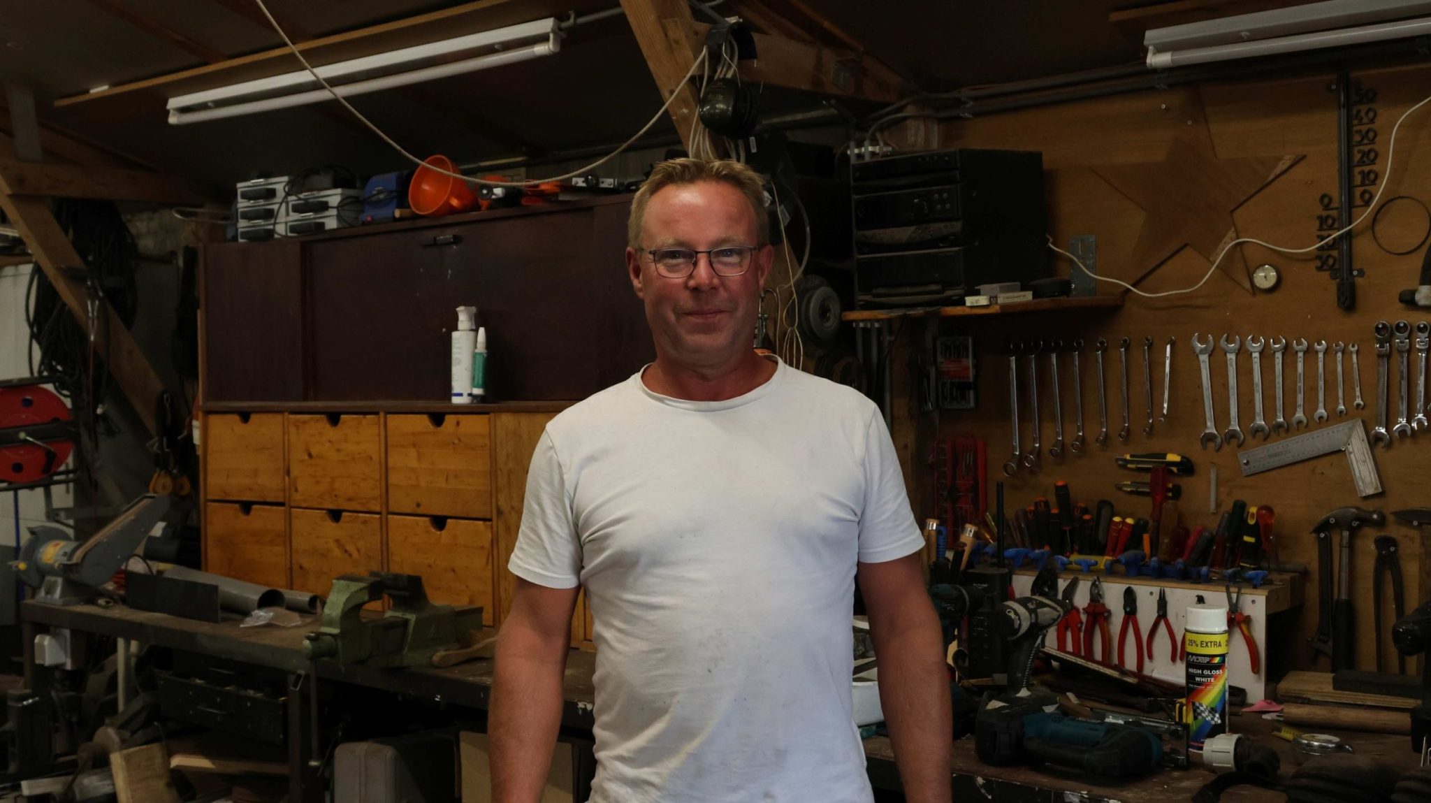 Met trots vertelt Wim dat de hydraulische werkbank afkomstig is uit een verzamelplaats van de PTT waar ze postkarren leeghaalden. Bij de post moest de juiste werkhoogte aangehouden worden, en Wim heeft dit geoptimaliseerd naar zijn eigen werkhoogte.