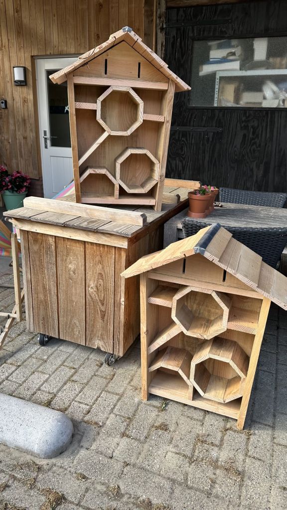 Zelf werkt Wim het liefst met Douglas hout, omdat dit hout een uitstekende vochtregulering kent. De insectenhotels hoeft hij overigens niet zelf te vullen.