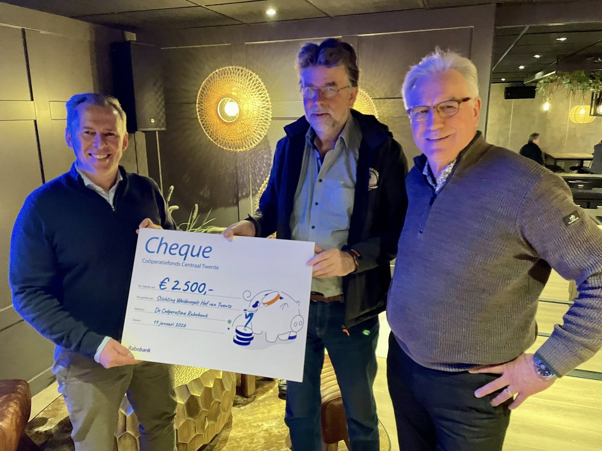 Het schitterende bedrag van 2500 euro nam het bestuur van de stichting Weidevogels Hof van Twente maandagavond in ontvangst in De Pol in Bentelo. Robin Geerdink, directeur van de Rabobank Centraal Twente, reikte een symbolische cheque met het bedrag uit aan de bestuursleden Willy Olde Meule en Anne van Veen.