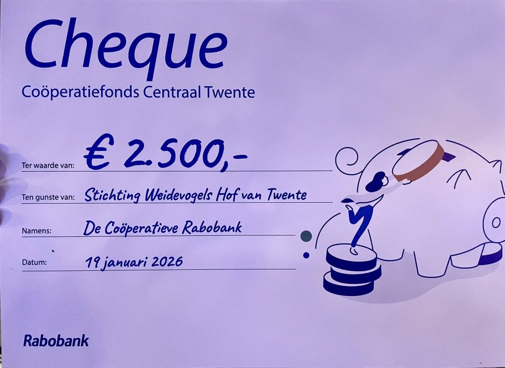 Het schitterende bedrag van 2500 euro nam het bestuur van de stichting Weidevogels Hof van Twente maandagavond in ontvangst in De Pol in Bentelo. Robin Geerdink, directeur van de Rabobank Centraal Twente, reikte een symbolische cheque met het bedrag uit aan de bestuursleden Willy Olde Meule en Anne van Veen.