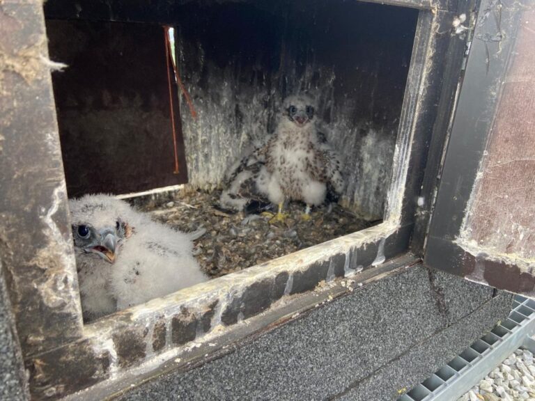 Enkele dagen na de ring sessie startte Mirjam met het meerdere dagen monitoren van de kast vanaf de grond. Hierdoor kon zij getuige zijn (en filmen) van de vlieg oefeningen die de jonge slechtvalken 2 weken na het ringen uitvoerde naast de kast op het dak van het kantoor gebouw